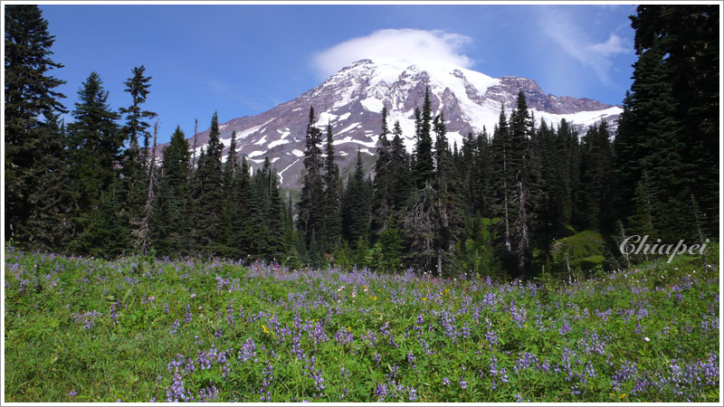 紫花映襯的 Rainier