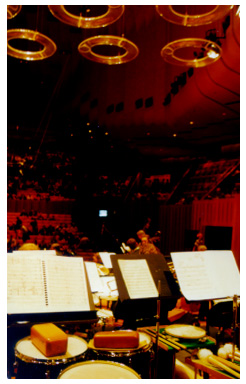 看看這張照片,有沒有覺得什麼地方很奇怪呢?嘿嘿!我們的座位竟然在打擊區後面呢!樂團後面的位置本來是要給合唱團坐的,但若某場演出沒有合唱團,就可以當成一般位置售票。我們就是這樣坐到這裡來的。