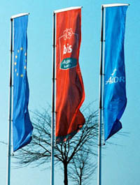 ![]() | 夫夫在機場附近拍了這張照片。Accor(最右邊的藍旗)是一家非常大的跨國連鎖旅館企業,旗下的旅館有各種等級:Novotel, Mercure, ibis(中間的紅旗), Etap, Fomule 1 ...(Novotel 一晚索價約 € 120,之後每級價差約 € 20~30 ) 在巴黎的第一晚,我們訂了最便宜的 Fomule 1,只要 € 35,跟 YH 的價錢差不多。(出發前的幾個禮拜歐元忽然狂飆,可能是美伊戰事的關係。 1 EUR. = 38.5 NTD.)除了必需使用公共衛浴之外,它們的房間實在不錯,很小但是乾淨:這裡有照片。在法國的兩個禮拜,我們的住宿問題幾乎全在 Accor 的各級旅館解決。 |