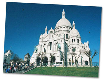 幸福地坐在教堂前的草地上,享受溫暖陽光和蔚藍天空,就這樣,我們手牽著手,走來走去,在白教堂周圍晃盪了一整個下午。(餓得受不了,又奢侈地買了個培根起司蛋可麗餅:€ 4.9) 來來往往的遊客和小販、漂亮的大教堂和玫瑰拼花玻璃、還有成群鴿子飛掠的廣場...嗯,沒錯沒錯,這就是巴黎最美麗的聖心白教堂。 ![]() | ![]() |