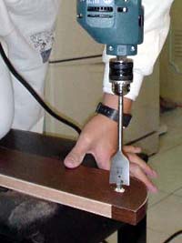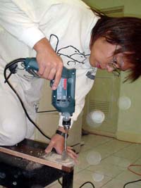 | ▲ 在側板鑽孔(猜猜這個孔幹嘛用的?) | ▲ 鑽孔的時候木屑飛揚,鏡頭都花了… |