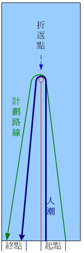 東之美的游泳場地是一個海邊的人工池,長1100公尺,寬150公尺。游泳的路線則是左邊出發,游到750公尺的地方從右邊折返。絕大多數的人為了游最短路徑,都是沿著中線前進。但是參賽者人數眾多,大家都沿著中線擠來擠去的,就會游得很不痛快。像我上一次在游泳的過程中不斷的被踢,還有同事被人家壓到下面,然後從他頭上超車過去。於是我這次決定要游外側一點,大約從距離中線30公尺的地方下水,然後慢慢的切到中間,預計在折返點的地方剛好回到中線去折返。這樣我就可以悠閒的依照自己的速度游泳,而不會被踢得心浮氣燥的。根據我的精算,這樣的路線只比沿著中線的路線多不了幾公尺,可惜人算不如天算。