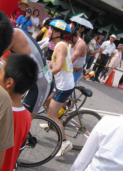 我們坐的是九點半的飛機,大家七點半從新竹集合,開車到松山機場去坐飛機,等到達肉球家時已經十一點了。大家手忙腳亂的將腳踏車組裝起來,並且調整了一下之後,然後大家急忙的把號碼貼紙貼到腳踏車跟安全帽上,再把轉印的號碼貼到手臂上,弄得滿頭大汗的,這時候已經十二點十分,距離比賽開始只剩下五十分鐘。由於時間緊迫,我們也來不及休息了,就直接往比賽場地出發,途中在7-11買了一點點心邊騎邊吃,到達比賽場地時已經是十二點四十了。把腳踏車牽進轉換區,再把等一下要換的車鞋、跑步鞋、背心準備好,喝了幾口水,就趕快往游泳池邊走去。到池邊時做了點熱身,四分鐘後就鳴槍了。