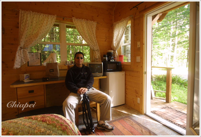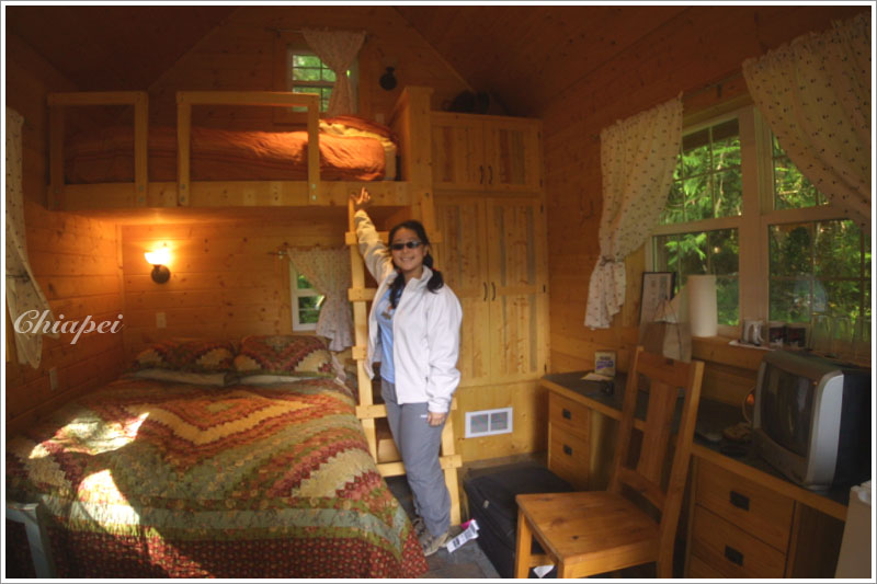 溫馨的色調、寬敞的空間、電視冰箱微波爐現磨咖啡一應俱全(抽屜打開還備有七八片DVD防無聊)、看起來超好睡的大床、另外還有個單人上舖,再加上屋外就是綠油油的森林,簡直就是夢幻小木屋!雖然房間裡沒有洗手間,但是專屬於 snow cabin 的盥洗室就在三十公尺外,因為掛了 snow cabin 的小牌子,所以別的小木屋的客人就不會來用,旅館主人將盥洗室同樣裝潢得溫馨夢幻,燈一打開還有暖氣,真是貼心到家了!